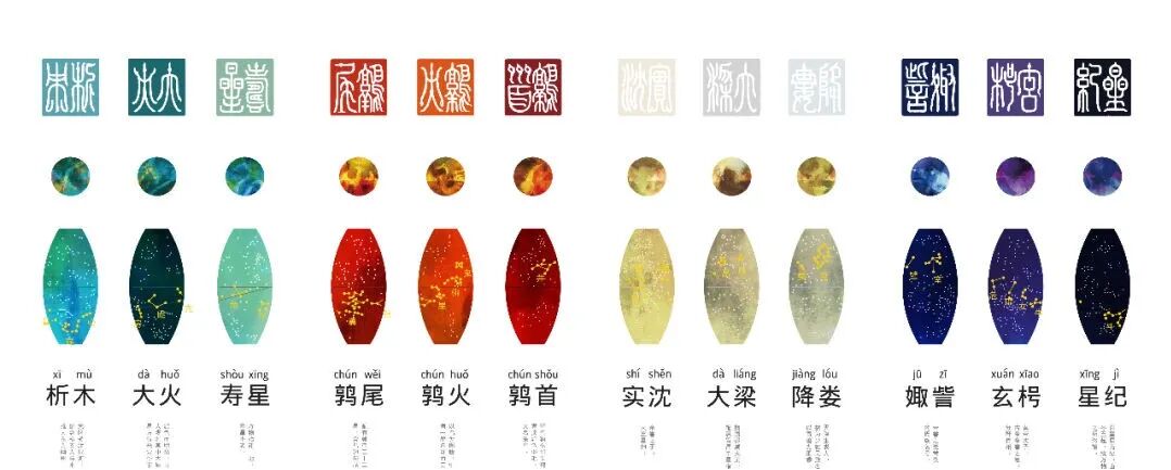 毕设主题“十二星次·篆”是将大连市非遗项目“金州鸟虫篆”与十二星次概念相结合的跨界尝试。在东方占星学中,黄道十二星次表示太阳在一个回归年所经过的黄道带十二个天区,对应四方四象,配属不同星宿,在中国古代天文学中占有重要地位。我们用金州鸟虫篆的书写方式设计了十二星次的文字,应用在饰品以及饰品的包装盒底,使得包装盒成为篆刻的载体。鸟虫篆精致秀丽,星空浩瀚而神秘,二者凝结于现代文创产品设计中,引发人们探寻中国文化图腾的兴趣。