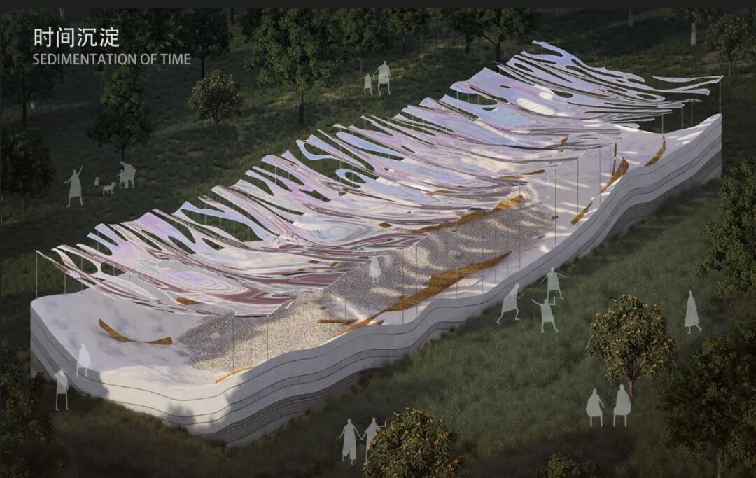 作品阐述:在城市更新的大背景下,公共艺术聚焦在沧州市大运河湾公园中。通过对在地的历史、文脉、记忆、故事的研究,将时间的河流与沉淀在一个方形类似考古现场的空间内表现出来。人们在这个空间中漫步,感受历史文化在时间河流中,沉淀在城市这个容器内。